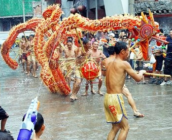 如今已發(fā)展成為對喜慶節(jié)日的慶祝,對美好生活祝福的一種方式。它用鮮棕葉作龍須,用葛藤、黃荊條、松樹枝作龍身,分9節(jié)、11節(jié)、1 3節(jié)、15節(jié)等不同長度的奇數(shù),由9至15人參加舞龍。伴著鑼、鼓、鎖吶的鏗鏘樂曲,一人持“寶”在前,龍舞歡騰時有“二龍搶寶”、“蛇蛻皮”、“烏龍絞柱”等50多種動作玩法。與此同時,身著民族服裝的群眾用臉盆、水瓢、銻桶等容器端水圍繞著龍潑澆,這樣邊舞邊潑水、水潑得越多龍舞得越歡,也預祝大家當年風調(diào)雨順,五谷豐登,其場面歡樂喜慶,風趣幽默。已列入我市第一批非物質(zhì)文化遺產(chǎn)保護名錄。