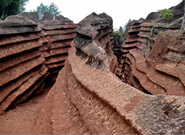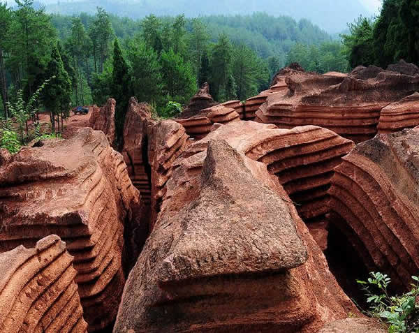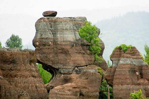 紅石林 告別船工后一切便突然安靜下來,過山谷的小路沒有人家,偶爾傳來幾聲清脆的鳥叫。穿過幾座隘口,峰回路轉后“石林”漸漸露臉,石頭的顏色是由灰白到棕紅,變幻而又使人聯(lián)想。間或一棵參天大樹,或是綠竹三兩棵,則又是另一番景致了。于高于低、于肥于瘦的石林,于石于樹、于濃于淡的色彩,顯得雄奇又雋秀,并透露出一種清靈飄逸。 這些石柱不但顏色各異,而且大小不等。有的高達七、八米,而有些則像半埋于地下的巨獸骨架。一位村民告訴記者,現(xiàn)在石林沒有以前壯觀,都長渣子(灌木)了。原因是由于山頂樹木減少,雨水將泥土帶下山,很多石頭都被埋在土下,后來這些地方都開墾了農田,石林也被永久覆蓋。 由于泥土覆蓋,石林被切割成一個個小區(qū)域,有些隱蔽在果林中,而有些則像突然從天而降,散落田間。