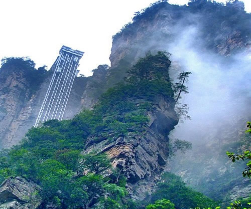 百龍電梯圖片 百龍?zhí)焯輾鈩?shì)恢宏,垂直高差335米,運(yùn)行高度326米,由154米山體內(nèi)堅(jiān)井和172米貼山鋼結(jié)構(gòu)井架等組成,采用三臺(tái)雙層全暴露觀光電梯并列分體運(yùn)行,每臺(tái)次載客50人次,運(yùn)行速度3米/秒,三臺(tái)同時(shí)運(yùn)行每小時(shí)往返量達(dá)4000人次。百龍?zhí)焯莸男藿▽?shí)現(xiàn)“山上游,山下住”的目標(biāo),提供了交通保障,將袁家界天下第一橋、迷魂臺(tái)、天懸白練以及烏龍寨、楊家界等絕世美景從幕后推向了前臺(tái),并將天子山、袁家界、金鞭溪等精品旅游線路連為一體,解決了多年困擾景區(qū)的交通瓶頸問(wèn)題。