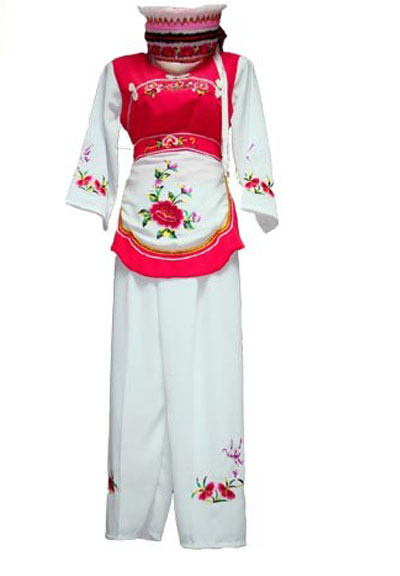 “崇尚白色”是白族人的一個(gè)明顯特點(diǎn)。不論男女都愛穿白色服飾,故有“要得俏,一身孝”之說,過去穿戴的白布又稱“家布機(jī)”,是白族人自己種棉花,自己紡紗,自己用土機(jī)織,用土法洗漂而成,其服飾美觀大方。一般來說,男子戴五尺、七或九尺的白布頭巾。上穿白色對襟布扣汗衣,外套青色滿肩馬褂,腰系桃花兜,并配撤穗荷包,下著青色寬腳褲,腳穿白布襪子和天官云頭鞋。婦女頭上蒙白色繡花帕,兩耳垂環(huán),手戴鐲子或戒指,外套繡花圍裙,用繡花飄帶系著,右上胸佩掛三吊或五吊銀質(zhì)牙簽。下著蘭色寬褲,腳纏白色裹腳布,穿繡花尖尖鞋。無婚女性則挽“簪巴”,挽于腦后的稱“粑粑”,挽于頭頂?shù)姆Q高把簪,簪上套有網(wǎng),橫插簪子;兒童衣服多繡花,外圍肚兜,頭戴虎頭鼓針菩薩帽,頸戴“項(xiàng)圈”、“百家鎖”等,手腕套有銀圈,上系小吊,吊上有錘、鈴、鞋、斧、簽等。