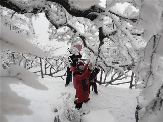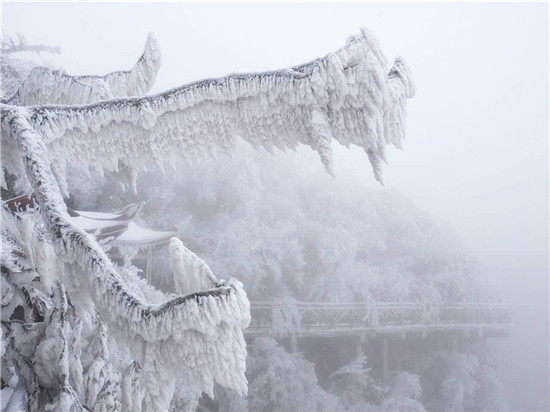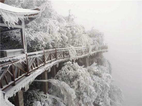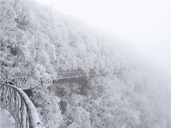 山頂上樹林不見了,取而代之的是形態(tài)各異的雪凇、冰掛;林間游道上覆蓋了厚厚的白雪,踩上去咯吱作響;絕壁上的棧道雪白一片,仿若是一條仙境之路...游客們玩雪、賞雪不亦樂乎。
